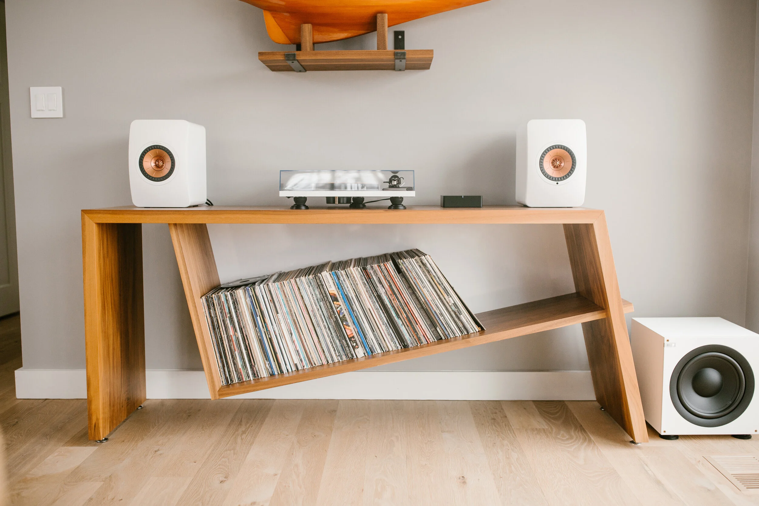 The Szymanskis wanted a solution to showcase their record player and speakers and display their classic records. They wanted something unique that would be the star of their living room. Clear Cut Design was given full creative authority to come up with this beautiful solid walnut console…